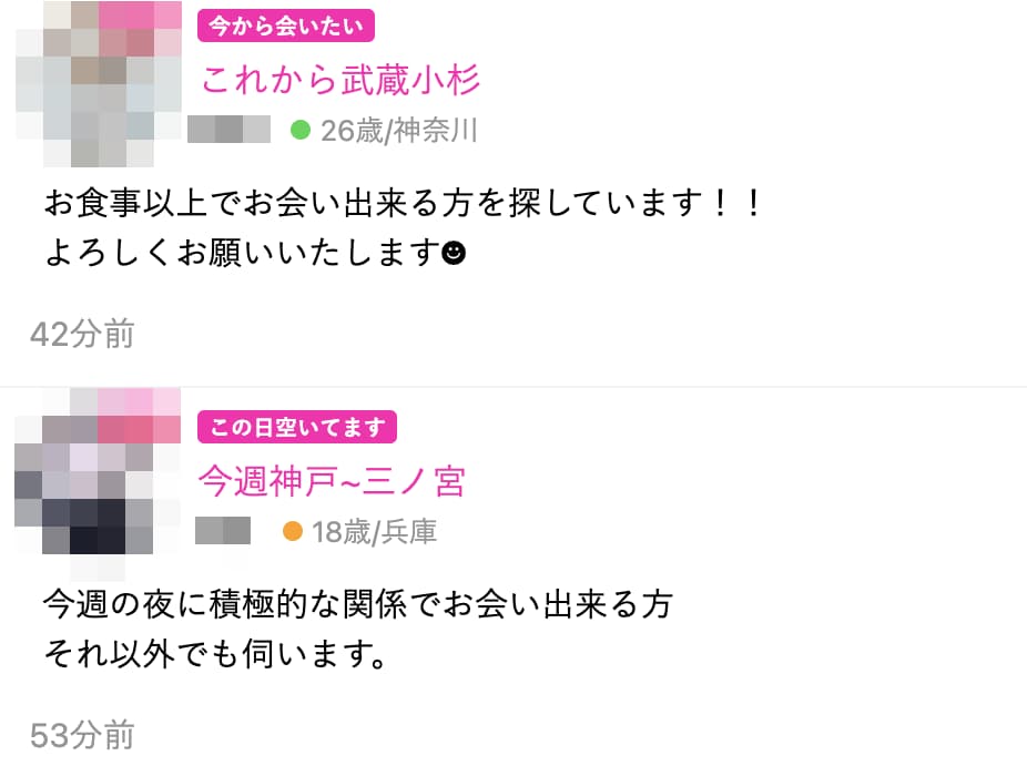 サクッとエッチしたいなら、「お食事以上、積極的、そのまま…」などの文言を書いてる子を狙ったほうがええで。「パパ活=援交」というのは暗黙の了解やが、運営的にセックスの募集を容認することはできん。違法やからな。